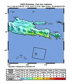 An earthquake occurred on June 3, 1994, at 01:17:37 local time (June 2, at 18:17:37 GMT) off the coast of Indonesia. The epicenter was off the eastern part of the southern Java coast, near the east end of the Java Trench.[3]