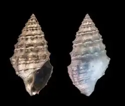 The length of the shell attains 7 mm. The teleoconch consists of 5.8 whorls, which are sharply angulated at one-quarter of whorl height on earlier spire whorls. The last whorl is strongly excavated with a short neck. The whorls are separated by a weakly impressed, strongly undulating suture margined by a prominent subsutural fold. The sutural ramp is wide, and strongly concave. The axial sculpture consists of short, prominent, opisthocline ribs, separated by interspaces much wider than them, extending from the lower suture to the shoulder angle where they are abruptly truncated and form sharp tubercles. Axial ribs rapidly vanishes on last whorl below periphery. There are 11-13 axial ribs on the penultimate whorl and 13–16 on the last whorl. The subsutural fold bears a row of tubercles more numerous than the axial ribs. The sutural ramp is sculptured by fine collabral threads sinuous in conformity with the anal sinus. The spiral sculpture consists of narrow, flattened cords. Earlier spire whorls with one peripheral cord forms a peripheral angulation, joined on the penultimate whorl by a weaker cord anteriorly. interstice between these two cords are sculptured by 1-2 very low threads. The last whorl with a third cord just below the suture and a fourth prominent peribasal cord bears tubercles. Interstices between the spiral cords are sculptured by 2-4 threads. The remaining part of the is base sculptured by 2-3 widely spaced low cords lacking intermediaries with 8-10 threads on the neck. The aperture is oblanceolate. Columella concave above, strongly twisted to left below forming a short, relatively narrow siphonal canal. The labial callus is relatively thick over columella, sculptured by microscopic rows of prickly nodules in its interior part. The parietal region is rendered angular by the peribasal cord. The outer lip is thin with a moderately deep, reversed L-shaped anal sinus. The protoconch is conical with 3.25 whorls; covered with minute, dense spiral threads rendered granulose when crossed by even finer axial threads with the subsequent part sculptured by opisthocyrt axial riblets extending from suture to suture on lower half of each whorl. The protoconch diameter is 0.57-0.67 mm. The protoconch color is yellowish-beige while the shell color is white.[2]