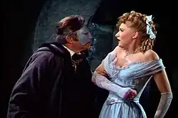 - Phantom of the Opera (1943): Featuring Claude Rains as the Phantom and the singer Susanna Foster as Christine. This film reused the same Paris Opera studio set as the original silent film and once again features the spectacular scene in which the Phantom causes the chandelier to crash down on the heads of the audience. In this version, however, horror is mostly downplayed in favour of grand operatic spectacle. The Phantom's anger is sparked by his belief that the credit for his musical compositions is being stolen by the music publisher. The Phantom's facial disfigurement is also caused by having had acid thrown in his face much like in song at midnight, rather than having been born disfigured, as in Leroux's original story. This accidental disfigurement became common, and copied in later film versions.