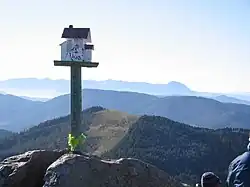 A stream is crossed and height is gained slowly out of the forest on to the fields. Overcoming the last south-bound stretch to the summit does not take very long, but it is demanding. Right before the summit heaps of stone in a karst terrain cover the trail.