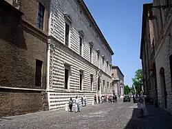 The walled medieval city of Ferrara was geographically limited from southward expansion by a branch of the delta of the Po river. In 1450, the prior Duke, Borso d'Este (1450) had enlarged slightly the city southward with reclaimed land from the river banks.[1]