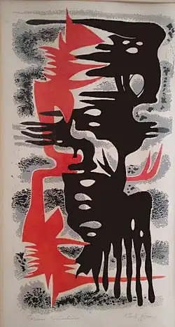 As an artist, he participated in biennials in São Paulo, Mexico and Switzerland; he also participated in group exhibitions in the United States, Japan, Belgium, the Vatican, Spain, Chile, Uruguay and Brazil.[1][2][8][9][11][12][13] He illustrated various books, such as Sarmiento's Facundo, José Hernández's Martín Fierro, Adonais, Percy Shelley's elegy and 30 woodcuts on William Henry Hudson's Tierra Purpúrea, among others.[1][2][14] A number of exhibitions of his work were held posthumously.[15][16]