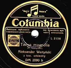 While Alexander considered himself Russian in general, he assumed he had some Polish blood too: "I never met people with my surname in Russia, but in Poland it is met more or less often... one of my great-grandfathers was probably a Pole".[2][4][5] He also recognised that he had some Ukrainian ancestry and Ukrainian as one of his native languages. In his letters Vertinsky recalled a time when he was working at Dovzhenko Film Studios and Ukrainian actress Natalia Uzhviy was surprised to hear his Ukrainian accent.[6][7][8][9]