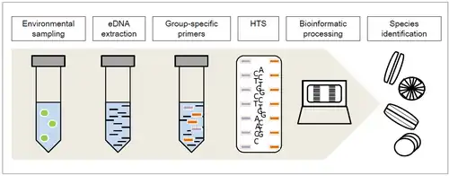 A newly applied method is diatom DNA metabarcoding which is used for ecological quality assessment of rivers and streams because of the specific response of diatoms to particular ecologic conditions. As species identification via morphology is relatively difficult and requires a lot of time and expertise,[1][2] high-throughput sequencing (HTS) DNA metabarcoding enables taxonomic assignment and therefore identification for the complete sample regarding the group specific primers chosen for the previous DNA amplification.