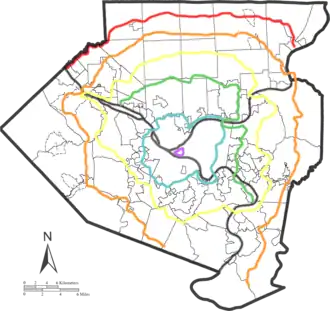 Unlike many major American cities with belt systems composed of number-coded limited-access roads, the Allegheny County Belt System roads are not intended to be used as high-speed routes. Rather, the system is a navigational aid for motorists in unfamiliar portions of the county.[1] Five routes were introduced in the early 1950s: from outermost to innermost, the Red, Orange, Yellow, Green, and Blue Belts. The Purple Belt was added later. All roads in the system retain their original names.