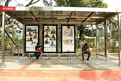 Back-lit display signage board with city map, seating arrangements, poly-carbonate semitransparent roof cover, dustbins, vertical signage posts including Global Positioning System (GPS) based public information system showing real time information of the plying Mo Buses are featured in the bus queue shelters. The public information system is linked to the Bhubaneswar Operations Centre of the Bhubaneswar Smart City Limited.[4]