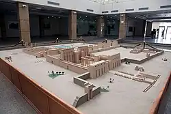 The temple's external dimensions are approximately 183.5 by 110.5 m, and consists of two parts: the large forecourt and the temple proper.[37] The large front court is 131.5 by 105.5 m, oriented on the east–west axis, and occupies the east part of the temple complex.[37] The western part of the court is on a higher level and is divided from the rest of the court by a low retaining wall. The lower court is almost square, whereas the upper terrace was rectangular in shape. The upper section of the court was paved with mud bricks and has a 4 m wide entrance to it from the lower part of the fore-court, connecting the base to the upper landing was a ramp enclosed by walls.[37] This ramp and entrance were both at the center of the temple, with the same orientation as the front court entrance and the temple proper.