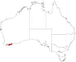 The known distribution range is restricted to a semi-arid area near the south coast of Western Australia, within the Southwest Australia bioregion known as the Esperance Plains.[1] Anigozanthos onycis was described from specimens obtained in sandy heathland between the Stirling Range and Green Range outcrops. It as relatively rare, occurring over a widespread range between the Murchison River and Albany, and extending to Bremer Bay in the east.[2] The species was later found in the Fitzgerald River National Park, emerging after a large bushfire in 1989 and disappearing again in 1991.[3]