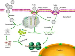 Aphthoviruses replicate in a similar fashion to all picornaviruses. Replication is cytoplasmic and initially involves attachment of the exogenous virus to the cell membrane. Attachment to the membrane and subsequent entry into the cell is mediated by a membrane receptor. After genome replication within the cytoplasm, virion assembly occurs and new virus particles aggregate within the cell. Release of virus particles is mediated by cell lysis.[1]