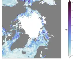 Atlantification is the increasing influence of Atlantic water in the Arctic. Warmer and saltier Atlantic water is extending its reach northward into the Arctic Ocean.[2] The Arctic Ocean is becoming warmer and saltier and sea-ice is disappearing as a result.[3] The process can be seen on the figure on the far right, where the sea surface temperature change in the past 50 years is shown, which is up to 5 degrees in some places. This change in the Arctic climate is most prominent in the Barents Sea, a shallow shelf sea north of Scandinavia, where sea-ice is disappearing faster than in any other Arctic region, impacting the local and global ecosystem.