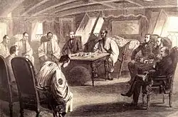 Franco-Anglo-Japanese conference on the Semiramis, 2 July 1863. Forefront: French interpreter Frederik Blekman, Japanese interpreter. Background (from left to right): Three Japanese governors of Yokohama, Duchesne de Bellecourt, daimyō Sakai-Hida-no-Kami, Colonel Neale (British representative in Japan), Admiral Jaurès, Admiral Kuper | |