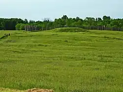 In 1850, Increase A. Lapham, an author, scientist, and naturalist, surveyed the site on behalf of the Smithsonian Institution, which was surveying ancient mounds. He described the outer stockade as being "631 feet (192 m) long at the north end, 1,149 feet (350 m) long on the west side and 700 feet (210 m) on the south side; making a total length of wall of 2,750 feet (840 m). The ridge or wall is about 22 feet (6.7 m), and from 1 foot (0.30 m) to 5 feet (1.5 m)) in height".[8] It had at least 33 square bastions at regular intervals along its length, similar in form and placement to some European fortifications, to allow defensive warriors to cover that area by shooting arrows. In addition, others were built along the secondary walls. Rather than having a gate to protect the entrance, the builders constructed the entrance so that it was camouflaged from direct view and blended in with the wall on either side.