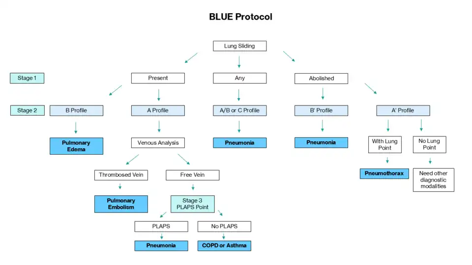 The BLUE protocol is a systematic approach to evaluating lung pathology through ultrasound, allowing for rapid differentiation of conditions such as COPD or asthma, pneumothorax, pulmonary edema, pneumonia, and pulmonary embolism.[1] By assessing specific lung zones and identifying characteristic ultrasound patterns, clinicians can quickly determine the cause of respiratory failure at the bedside.[1] In the emergency department setting, the BLUE protocol can be modified for assessment of pericardial and pleural effusions.[4]