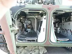The commander's station is located behind the driver's station and is provided with a removable OU-3GA2 or OU-3GK infrared searchlight with an effective range of about 400 metres (440 yd).[30] A dual mode (day/night) TKN-3B 5x/4.2x magnification binocular vision device is coupled to the infrared searchlight. Two periscope vision blocks are fitted with a heating and cleaning system.[31][32] The commander's station is equipped with an R-123M radio set.