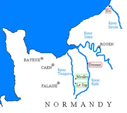 He was originally from Meulles or nearby Le Sap, in Calvados, Normandy. He was a younger son of Gilbert, Count of Brionne and of Eu, in Normandy.
