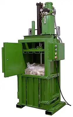 Industrial balers are typically used to compact similar types of waste, such as office paper, cardboard, plastic, foil, and cans, for sale to recycling companies. These balers are made of steel with a hydraulic ram to compress the material loaded. Some balers are simple and labor-intensive but are suitable for smaller volumes. Other balers are very complex and automated and are used where large quantities of waste are handled.