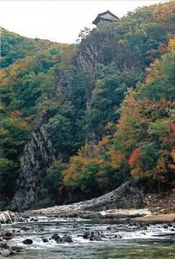 In front of Banyasa Temple, Gusucheon Stream, fed by water from Mt. Baekhwasan, forms an S-shape, which some people see as a “taegeuk.” (symbol of great polarity or yin-yang). In the center of the stream rises a lotus bud-shaped piece of land, on which Banyasa Temple seems to lean. The temple's Munsujeon Hall perches atop a 100-meter-high cliff that overlooks the stream. The Hall reminds visitors they are in the sanctuary of Manjusri Bodhisattva.