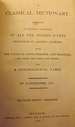 The Bibliotheca Classica (Reading, November, 1788), or Classical Dictionary containing a full Account of all the Proper Names mentioned in Ancient Authors, is the best-known work of John Lemprière, an English classical scholar. Edited by various later scholars, the dictionary long remained a readable if not absolutely trustworthy reference book in mythology and classical history. Lemprière wished "to give the most accurate and satisfactory account of all the proper names which occur in reading the Classics, and by a judicious collection of anecdotes and historical facts to draw a picture of ancient times, not less instructive than entertaining."[1]