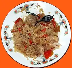 Bigos (Polish pronunciation: [ˈbʲiɡɔs] ⓘ),[a] often translated into English as hunter's stew, is a Polish dish of chopped meat of various kinds stewed with sauerkraut, shredded fresh cabbage and spices. It is served hot and can be enriched with additional vegetables and wine.[3] Originally from Poland, the dish also became traditional in the areas of the vast Polish–Lithuanian Commonwealth.[4][5]