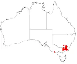 This bossiaea is found in north-eastern and far eastern Victoria, far south-eastern New South Wales, and in the Australian Capital Territory, growing in alpine and subalpine areas at altitudes above 800 m (2,600 ft), growing in heath and woodland (often bordered by grassland).[3][5]