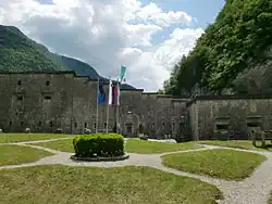 From 1868, during the Austro-Hungarian period when the Littoral was part of Cisleithanian Austria, Flitsch was administered within the Tolmein district (one of the 11 districts within the Littoral).[6] The Austro-Hungarian Army had two fortresses erected along the Predil Pass road: the well-preserved Kluže Fortress in 1881–82 and the ruined Fort Hermann.