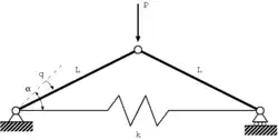 Using the concept of total potential energy, , it is possible to identify four fundamental forms of buckling found in structural models with one degree of freedom. We start by expressing where is the strain energy stored in the structure, is the applied conservative load and is the distance moved by in its direction. Using the axioms of elastic instability theory, namely that equilibrium is any point where is stationary with respect to the coordinate measuring the degree(s) of freedom and that these points are only stable if is a local minimum and unstable if otherwise (e.g. maximum or a point of inflection).[8]