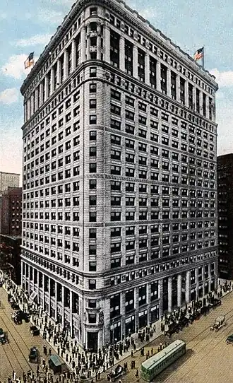 Daniel Burnham was a frequent associate of Field, designing an annex to the Marshall Field and Company Building (1892) and the Field Museum of Natural History (c. 1900). Burnham, with Frederick P. Dinkelberg, completed his design for the building shortly before leaving Chicago in April 1912; he died in Germany two months later.[2][3] The building resembles Burnham's Flatiron Building in New York City: both buildings are twenty-one stories, have rounded corners, and are decorated in a Beaux-Arts style. Both buildings are thought to be influenced by the Palazzo di Propaganda Fide in Rome. Ernest R. Graham, Peirce Anderson, and Edward Probst assumed control of the project on April 30. It was completed under the auspices of Graham, Burnham & Co. (a precursor of Graham, Anderson, Probst & White) in 1913.[2]