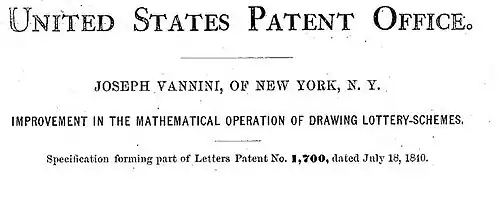 The first financial patent for which any detailed written description survives was to a printing method entitled "A Mode of Preventing Counterfeiting" granted to John Kneass on April 28, 1815.[6] The first fifty years of the U.S. Patent Office saw the granting of forty-one financial patents in the arts of bank notes (2 patents), bills of credit (1), bills of exchange (1), check blanks (4); detecting and preventing counterfeiting (10), coin counting (1), interest calculation tables (5), and lotteries (17).