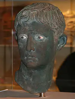 Octavian was raised for at least part of his childhood in his father's hometown of Velletri.[30] Octavian's father, also named Gaius Octavius, came from a moderately wealthy equestrian family of the gens Octavia.[31][25][i] His paternal great-grandfather Octavius was a military tribune in Sicily during the Second Punic War. His grandfather was a banker, while his father became a Roman senator, was distinguished as a praetor by 61 BC,[25][33] and then became a governor of Macedonia.[34][j] His mother, Atia, was the niece of Julius Caesar.[25][31][35]