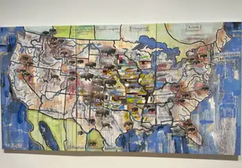 Many Indigenous people groups and nations including the Cherokee, Choctaw, Chickasaw, and Muscogee-Creek, carry on their moundbuilding traditions similar to those of Cahokia.[86] Native American people continue to venerate the site as sacred, coming to the grounds to perform ceremony and dance.[87][88] The site has served as inspiration for much Native American art. Notably Howard Revard, an esteemed poet and member of Osage Nation, wrote about the site in Winning the Dust Bowl.[89] Artist Jaune Quick-to-See Smith, a member of the Confederated Salish and Kootenai Tribes, displayed the works, "State Names Map: Cahokia" and "Trade Canoe: Cahokia", both inspired by the site, as part of an exhibit at St. Louis Art Museum.[90]