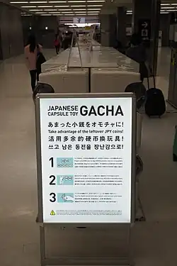 A capsule toy (カプセルトイ, kapuseru toi) is a type of small vending machine in Japan, in which a user inserts a coin and turns the rotating lever to receive a released toy in a capsule. The term also refers to the actual toy that is released. As of 2023, with its diversification, active manufacturing of products and machinery as well as installation of wholesale machines, capsule toys are attracting attention as a new industry. Various names exist depending on the time period, region, and selling manufacturer, such as Gacha-Gacha, Gashakoko, Gachapon, Gashapon, Gacha, and P-cup, because these names are registered as trademarks by various companies.[1] This article will use the term capsule toy.