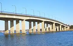 The Captain Cook Bridge is a road bridge that carries Taren Point and Rocky Point Roads across the Georges River in southern Sydney, in the state of New South Wales, Australia. The precast prestressed concrete girder bridge crosses near the river mouth as it empties into Botany Bay; and links the St George and Sutherland areas of Sydney. The bridge comprises a dual carriageway with three lanes in each direction of highway grade-separated conditions; and pedestrian and bicycle traffic, via two grade-separated paths. on the eastern and western sides of the bridge.