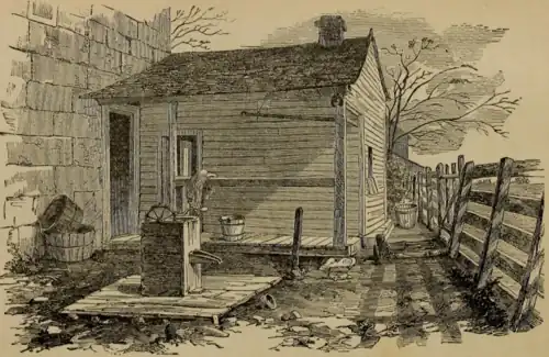 The jail was built in 1839, constructed of red limestone quarried nearby. The building is rectangular and measures 29 feet (8.8 m) by 35 feet (11 m). It is a gable-front building has two stories and an attic. Like other county jails built during the same period, Carthage Jail was built to incarcerate petty thieves and debtors and as a temporary holding place for violent criminals. The first floor contained a debtor's room in the northwest corner, and a dungeon, or "criminal cell", was located on the north side of the second floor. The living area for the jailer's family included a kitchen and dining room on the first floor and a bedroom on the second floor. A small "summer kitchen" was added later.[2][3]