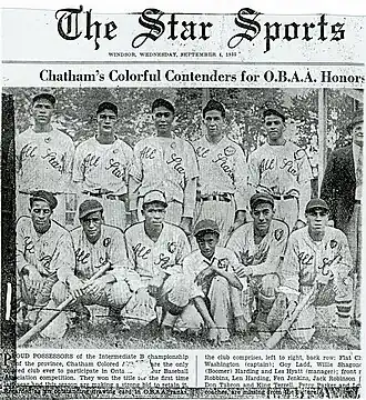 The team was formed in 1932 as a group of friends playing baseball in Stirling Park in the east end of Chatham, Ontario. The following year in 1933, the team was noticed by Archie Stirling, a local business owner and representative for the Ontario Baseball Amateur Association (OBAA).[2] This was significant because until the late 1940s black players were banned from major league baseball and were not always welcome onto white teams at the amateur level in Canada either. As the team was already barnstorming exhibition games in southern Ontario, Stirling brought them into the city league where they were able to compete against white teams. Quickly gaining in popularity, The Chatham Coloured All-Stars became known by many, including local reporters. In their second year playing in the league, they won the provincial championship, Intermediate B division, making them the first black team to win an OBAA title.[2] In 1935, the team won the city title as well as the Western Counties Baseball Association Championship, Intermediate A division. In 1939, the Chatham Coloured All-Stars reached the all-Ontario finals but there was a dispute regarding the game location and no title was awarded that year.[2] After this, the team ultimately stopped playing as several team members went to serve in World War II. Some of these members included Wilfred "Boomer" Harding, Andy Harding and one of the coaches Lou Pryor. Although the team had been playing for more than a decade before Jackie Robinson entered the major league in 1947, none of the Chatham Coloured All-Stars had the opportunity to play in the major leagues.[2]