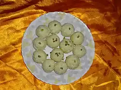 In the case of sweet production, the cheese is drained, kneaded on a wooden board and mixed with sugar and a binding agent such as arrowroot or semolina flour.[35] It is common now for machines to be used for the kneading process. The chhena is then rolled into balls ready for use in confectionary making.[36] Some of the popular sweets and desserts that use chhena as their base include rasogolla, sandesh, chum-chum, chhana murki, chhana podo, Ras malai, chhana balushahi, and khorma/belgrami.[30] Chhena has also been blended with cream and made into a commercial refrigerated spreadable cheese.[37] The chhena production process can be used to create a bioplastic which presents future innovation opportunities for the technology sector of India. However, this has raised ethical concerns domestically regarding food security for the wider population, as segments of the population struggle with rising food prices and malnutrition.[38]