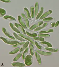 - Picocystophyceae (1 species):[6] unicellular coccoids, ovoid and trilobed in shape. Cells are surrounded by a multi-layered cell wall of poly-arabinose, mannose, galactose and glucose. No sexual reproduction has been described. They are capable of asexual reproduction through autosporulation, resulting in two or rarely four daughter cells. Each cell contains a single bilobed chloroplast with diatoxanthin and monadoxanthin, without any pyrenoid or flagella. Present in saline lakes.[68][53][57]