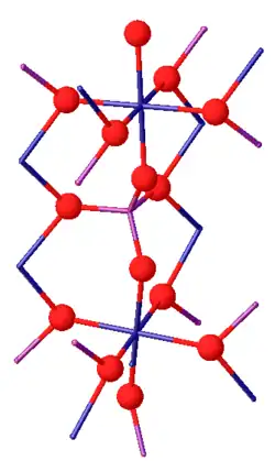 Chromium(III) phosphate can exist as two isomorphs. Its β-isoform is orthorhombic with the Cmcm space group (a = 0.5165, b = 0.7750, c = 0.6131 nm). The structure consists of infinite chains of trans edge-sharing CrO6 octahedra, which run parallel to the c-axis, and are linked by PO4 tetrahedra. Above 1175 °C, β-CrPO4 converts to α-CrPO4. α-CrPO4 is orthorhombic as well, with the Imma space group (a = 1.0380, b = 1.2845, c = 0.6278 nm). The structure consists of an infinite network of linked polyhedra with a CrO6 octahedron and a PO4 tetrahedron sharing a common edge. The Cr3+ site form edge-sharing Cr(2)/Cr(2') pairs and share two corners with the four Cr(1) octahedra.[7]