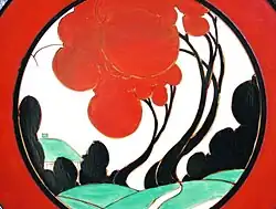 The Fantasque range evolved between 1928 and 1934 and mainly featured abstracts or landscapes of cottages and trees, as well as some Art Deco inspired patterns. The first Fantasque landscape pattern was Trees and House, which sold well from 1930 until at least 1934. However, it was the slightly later, more sophisticated Autumn pattern issued near the end of 1930 which was more popular. Originally created in red, coral-green and black, from 1930 to 1931 many colourway variations appeared. The rarest is the red colourway, shown on a 13-inch (330 mm) wall plaque. The best selling version at the time was one with trees in blue, green and yellow. All these variations are collectables.