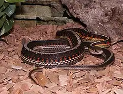 The common garter snake (Thamnophis sirtalis) is a species of snake in the subfamily Natricinae of the family Colubridae. The species is indigenous to North America and found widely across the continent. There are several recognized subspecies. Most common garter snakes have a pattern of yellow stripes on a black, brown or green background, and their average total length (including tail) is about 55 cm (22 in), with a maximum total length of about 137 cm (54 in).[2][3] The average body mass is 150 g (5.3 oz).[4] The common garter snake is the state reptile of Massachusetts.[5]