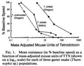 The common garter snake uses toxicity for both offense and defense. On the offensive side, the snake's venom can be toxic to some of its smaller prey, such as mice and other rodents.[10] On the defensive side, the snake uses its resistance to toxicity to provide an important antipredator capability.[11] A study on the evolutionary development of resistance of tetrodotoxin compared two populations of Thamnophis and then tested inside a population of T. sirtalis. Those that were exposed to and lived in the same environment as the newts (Taricha granulosa) or rough-skinned newt, that produce tetrodotoxin when eaten were more immune to the toxin (see figure).[11]It seems that the two species were in an evolutionary arms race.