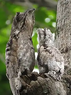 The common potoo seeks to mimic the perch on which it rests, using a technique called masquerading. Adult and juvenile potoos choose perches that are similar in diameter to their own bodies so that they can better blend in with the stump.[21] Most potoos choose stumps and other natural materials on which to rest, but some adults have been spotted perching on human-made items. These birds adjust their perching angle to best mimic the stump where they are.[21]
