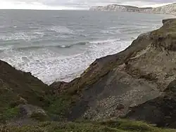 Compton Chine is a geological feature on the south west coast of the Isle of Wight, England. It lies between the village of Brook to the east and Freshwater Bay to the west. It is a small sandy coastal gully, one of a number of such chines on the island created by stream erosion of soft Cretaceous rocks. It leads from the 50 foot high clifftop to the beach of Compton Bay.