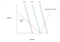 Another situation a corner solution may arise is when the two goods in question are perfect substitutes.[5] The word "corner" refers to the fact that if one graphs the maximization problem, the optimal point will occur at the "corner" created by the budget constraint and one axis.[4]
