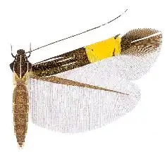 Male, female. Forewing length 3.7 mm. Head: frons ochreous-white, vertex, neck tufts and collar dark brown with reddish gloss, laterally and medially lined white; labial palpus first segment very short, white, second segment three-quarters of the length of third, dark brown with white longitudinal lines laterally and ventrally, third segment white, lined dark brown laterally; scape dorsally shining dark brown with white anterior line, ventrally shining white, antenna dark brown with a white line from base to three-fifths, often partly interrupted, followed towards apex by eight dark brown segments, two white, two dark brown, two white, ten dark brown, four to five white and two or three dark brown segments at the apex. Thorax and tegulae dark brown with reddish gloss, thorax with a white median line, tegulae lined white inwardly. Legs: dark greyish brown, femora of midleg and hindleg shining ochreous grey, foreleg with a white line on tibia and tarsal segments one and two, segment three white in basal half, segment five entirely white, tibia of midleg with white oblique basal and medial lines and a white apical ring, tarsal segment one lined white on the outside and with a white apical ring, segments two and four with white apical spots and segment five entirely white, tibia of hindleg as midleg, tarsal segments one to four with white apical rings, segment five dorsally white, spurs white dorsally, greyish brown ventrally. Forewing shining dark brown with reddish gloss, four white lines in the basal area, a subcostal from base to one-quarter, slightly bending from costa, a short medial in the centre underneath the end of the subcostal, a subdorsal about as long as the medial, but slightly further from base, a yellow-orange transverse fascia beyond the middle, narrowed towards dorsum, bordered on the inner and outer edge by broad tubercular golden metallic fasciae, the inner fascia almost perpendicular on dorsum, not reaching costa and with a blackish spot subcostally on the outside, the outer fascia inwardly oblique and strongly narrowed at one-third from the costa, lined dark brown on the inside at costa and dorsum, a white costal streak beyond the outer fascia, a white apical line from the distal half of apical area to apex, cilia dark brown around apex, paler towards dorsum. Hindwing dark greyish brown, cilia dark brown. Underside: forewing shining greyish brown, the white costal streak indistinctly and the white apical line distinctly visible in the apical cilia. Abdomen dorsally dark greyish brown with reddish gloss, ventrally dark grey, in the middle shining ochreous-white, segments banded shining white posteriorly, anal tuft dorsally dark grey, ventrally ochreous-white.[1]