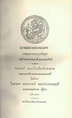 The earliest known printed cremation volume is generally regarded to be that published for the royal cremation ceremony of Queen Sunanda Kumariratana (a consort of King Chulalongkorn) and her daughter in 1881: a selection of Buddhist verses and chants, of which 10,000 copies were printed.[1] A possible earlier example, sets of the epic Phra Aphai Mani printed by Samuel J. Smith for the royal cremation of King Mongkut in 1869, was discovered in 2006, though it has yet to receive further in-depth study.[3] Printing had been introduced to Thailand by American missionaries in 1835, and quickly gained popularity from the 1860s. The increased accessibility of the press and the medium led to a gradual proliferation of commemorative books, especially cremation volumes, which were seen as more lasting in value than the usual trinket gifts, and were commissioned by noble and well-to-do families following the royal example.[1][4]