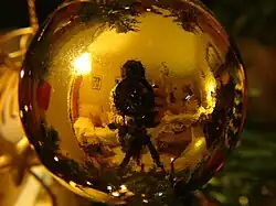 Round convex mirrors called Oeil de Sorcière (French for "sorcerer's eye") were a popular luxury item from the 15th century onwards, shown in many depictions of interiors from that time.[3] With 15th century technology, it was easier to make a regular curved mirror (from blown glass) than a perfectly flat one. They were also known as "bankers' eyes" because their wide field of vision was useful for security. Famous examples in art include the Arnolfini Portrait by Jan van Eyck and the left wing of the Werl Altarpiece by Robert Campin.[4]