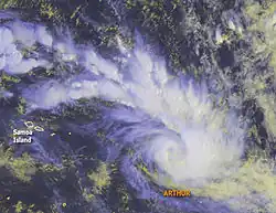 Cyclone Arthur (RSMC Nadi designation: 08F, JTWC designation: 09P) was the eighth tropical depression and fourth tropical cyclone of the 2006–07 South Pacific cyclone season. Forming as tropical depression on January 25, Arthur rapidly intensified into a strong Category 2 cyclone on the Australian intensity scale according to the Regional Specialized Meteorological Centre in Nadi, Fiji. The Joint Typhoon Warning Center assessed the storm to have peaked as a minimal category 1 cyclone. Shortly after peaking in intensity, the cyclone began to weaken due to unfavorable conditions. Quickly moving towards the east-southeast, the Arthur began to undergo an extratropical transition. After turning towards the southeast, the center of circulation was almost fully exposed due to strong wind shear. However, Arthur briefly re-strengthened late on January 26 before becoming extratropical the next day. Tropical Cyclone Arthur affected several small islands during its existence. French Polynesia observed the most noteworthy effects from the storm, where several landslides damaged a few homes.