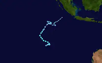 By 12:00 that same day, both the BoM and JTWC reported that Robyn reached its peak intensity, becoming a category 2 tropical cyclone with 10-minute sustained winds of 55 knots (102 km/h; 63 mph).[2][8] However, strong wind shear and significant mid-level dry air entrainment made the system to rapidly weaken, prompting the BoM to downgrade Robyn to a category 1 tropical cyclone by 29 November.[9][8] Six hours later, the BoM downgraded Robyn below tropical cyclone intensity,[2] before issuing their final advisory at 12:00 UTC that same day.[10] The JTWC followed suit three hours later, noting that the system had rapidly weakened, with a fully exposed centre.[11] The remnants of Robyn then drifted westward, moving out of the Australian area of responsibility in early December.[2]