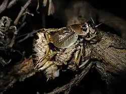 | Mating pair of sagebrush crickets (female left, male right) | |