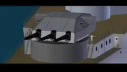 The design's secondary battery comprised eight 15 cm (5.9 in)/55 SK C/28 quick-firing guns in four twin turrets, two abreast the conning tower and the other pair abreast the rear funnel.[1] The guns fired a 45.3 kg (100 lb) shells at a muzzle velocity of 875 m/s (2,870 ft/s). With a maximum elevation of 40°, the guns could fire out to 23,000 m (75,000 ft).[6] These guns had already been ordered by the time construction of the ships was canceled; their availability influenced the design of the Scharnhorst class,[3] which mounted eight of their twelve 15 cm guns in dual turrets.[7]